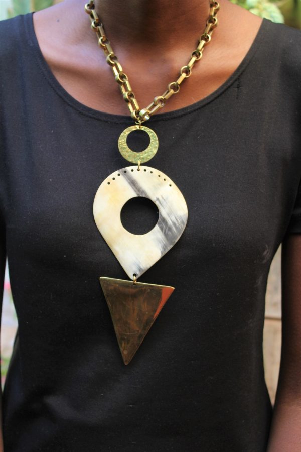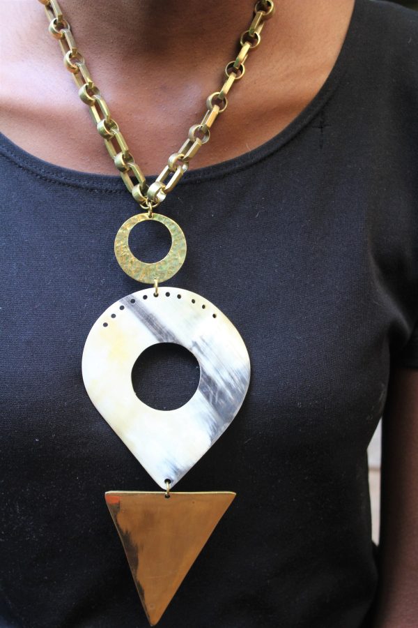 Crafted with a horn and brass, beaded pendants. Finished with a brass hook clasp.