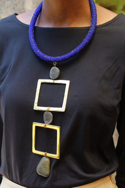 Crafted with African beads and a brass pendant, Finished with a brass clasp.
