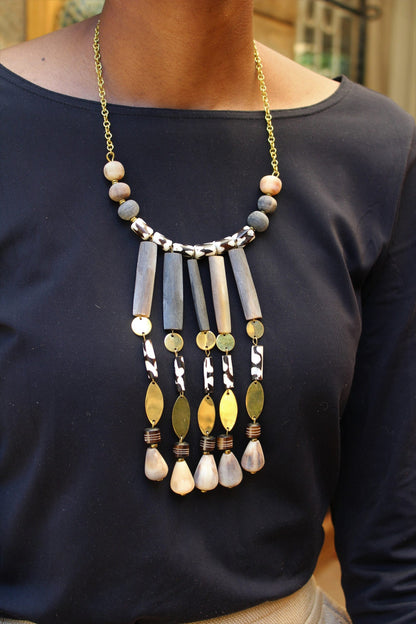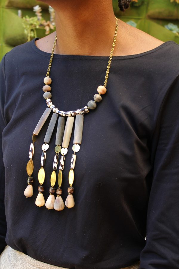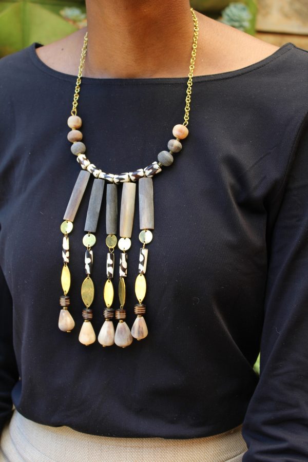 Crafted with horn and tribal african beads. Adorned with a brass pendants and chain, finished with a brass clasp.